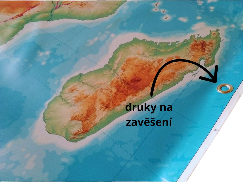 Pro leší orientaci obsahuje mapa hranice států a zeměpisnou síť. Je vytisknutá na umělohmotné plachtě, která je velmi odolná a vydrží i zvýšenou zátěž. Součástí mapy jsou druky k zavěšení. Při znečištění ji stačí otřít vlhkým hadříkem.