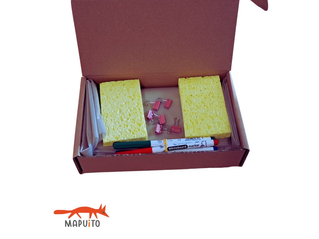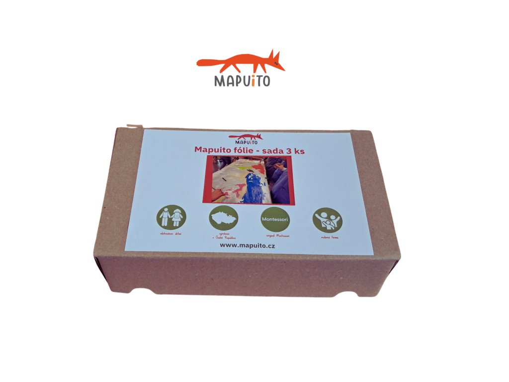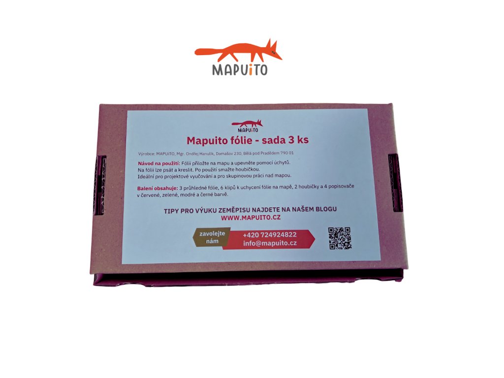 Sada tří průhledných fólií určených přímo k mapám Mapuito. Učitelé i žáci mohou na fólie opakovaně psát, malovat a procvičovat zeměpisné znalosti – stačí setřít a začít znovu.