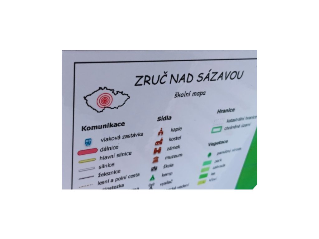 Mapa je vybavená legendou a obsahuje ty nejdůležitější místopisné prvky jako je např. škola, obchod, pošta, zastávka nebo památný strom. Obsah mapy s vámi budeme konzultovat, aby obsahovala vše co je pro vás důležité.