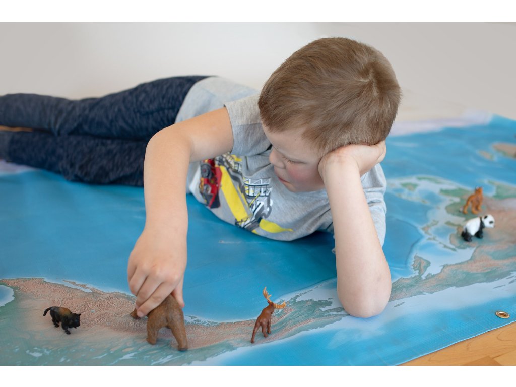 Podle návrhu Marie Montessori jsou polokoule zobrazeny s centrováním na Tichý oceán. Děti díky tomu objevují zajímavé vztahy a souvislosti. Velikost a odolnost mapy umožňuje skupinovou práci ve třídě i venku v přírodě.