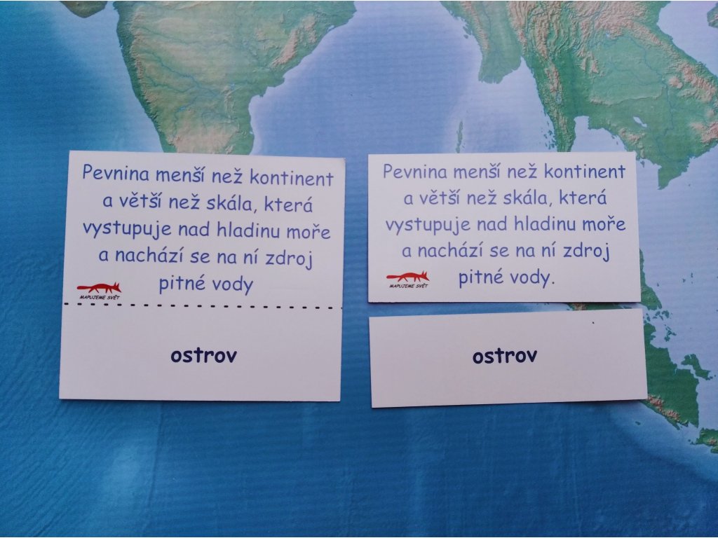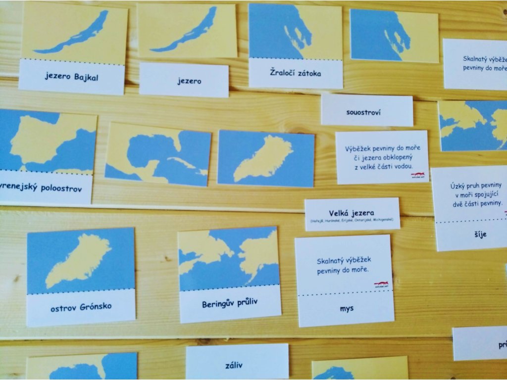 Způsob použití karet ve třídě: Dítě spojuje obrázky s textovými kartami a na základě nápovědy hledá v mapě konkrétní případ tvaru pevniny. Dítě práci kontroluje třetí kartou, která obsahuje obrázek i text.