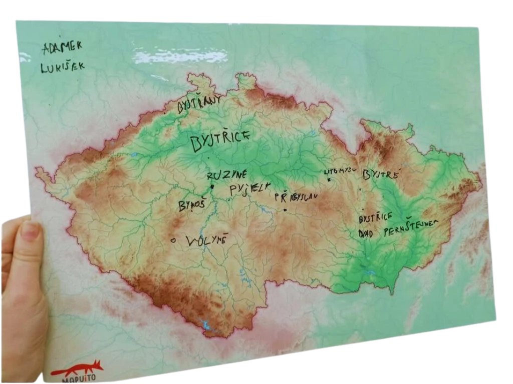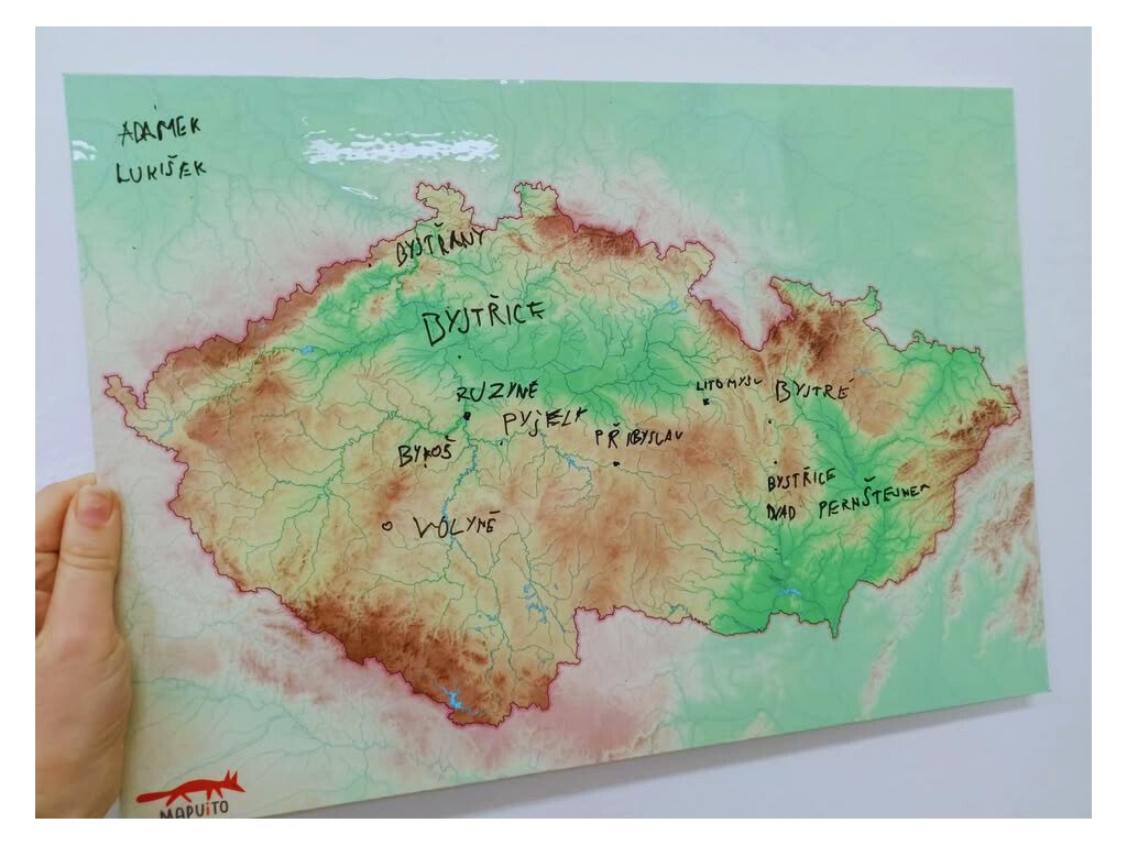 Pět popisovačů a houbiček na mazání, 3D mapku Česka.