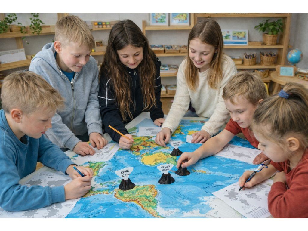 Děti pracují s modely sopek, které pomocí atlasu a pracovního listu umisťují na mapu světa. Ke každé sopce přiřazují sopečný oblak s názvem a výškou, čímž si přirozeně upevňují znalosti a rozvíjejí orientaci na mapě. Pomůcka podporuje aktivní zapojení, práci s informacemi i samostatné objevování.