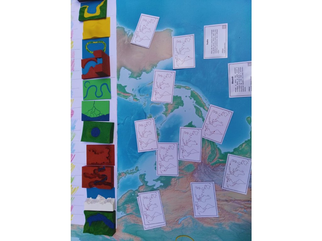 Sada obsahuje 14 modelů a 14 kartiček s popisem tvarů a jejich vzniku i s uvedenými příklady na mapce světa. V sadě najdete tyto tvary: