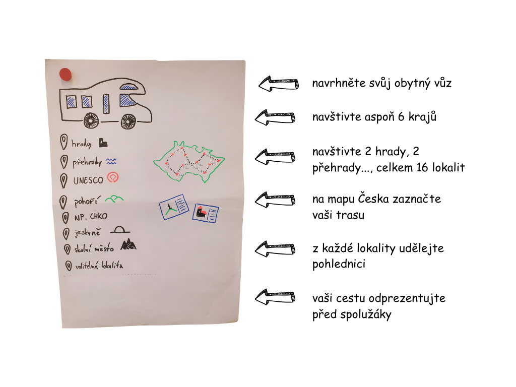 Každá skupina dostala velký arch papíru formátu A2, na který nakreslila obrys České republiky a vyznačila trasu své cesty. Ta musela být navrhnutá tak, aby jednotlivé zastávky logicky navazovaly. Děti ke každé lokalitě vytvořily pohlednici s obrázkem a základními informacemi o místě.